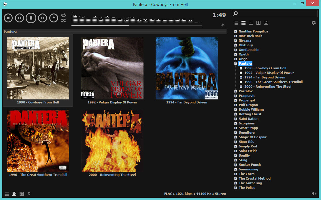 1) "Плоский" режим с фоновой обложкой - это просто список треков с разделением по альбомам или по папкам (если прилетели из Проводника)