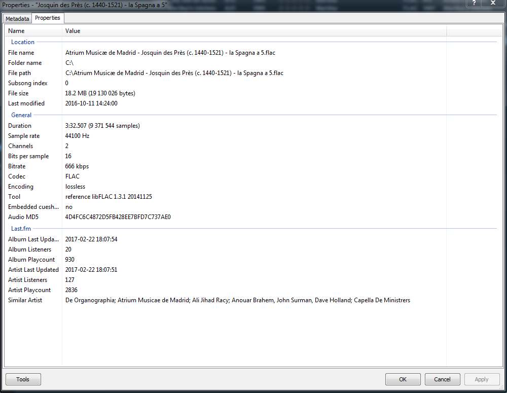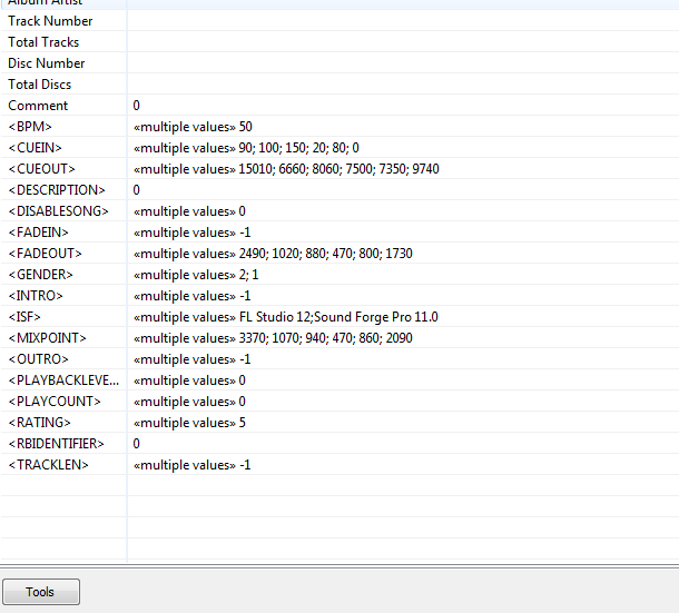 В контекстном меню трека Properties, что foobar2000 показывает? Сделайте скрин обеих вкладок Metadata и Properties.Janik:Некоторые программы, работающие с аудиофайлами разных форматов, записывают в них свои значения, создавая теги с именами, например [MIXPOINT], [FOUTOUT] и т.д.