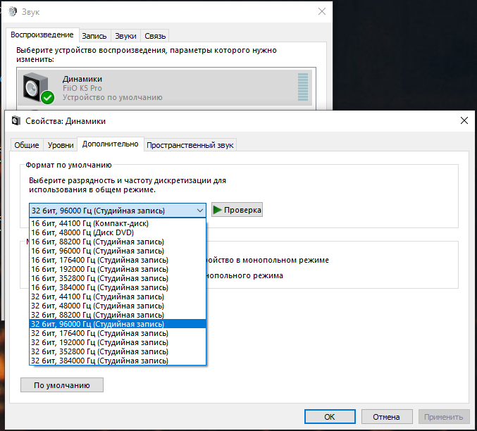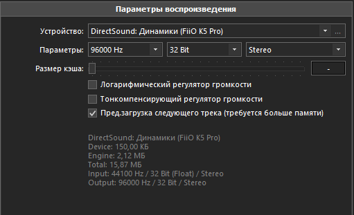 Вроде как у людей при воспроизведении разных файлов цап автоматом меняет цвет диода, но у меня он всегда один и меняется при изменении его свойств в Windows (Звуки - Воспроизведения - FiiO K5PRO - Свойства - Дополнительно - Формат по умолчанию) и там я выбрал 32 бита 96 кГц.