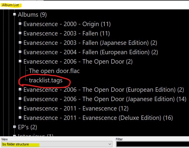 George Smith, файл tracklist.tags нужно положить в отдельную папку.У меня например лежит в двух папках а третья добавлена на слежение,получается хорошо.А зачем разворачивать .tags именно в Album List? Одинарный клик по файлу tracklist.tags и он развёрнут в плейлисте Playlist view или какой там установлен у тебя.