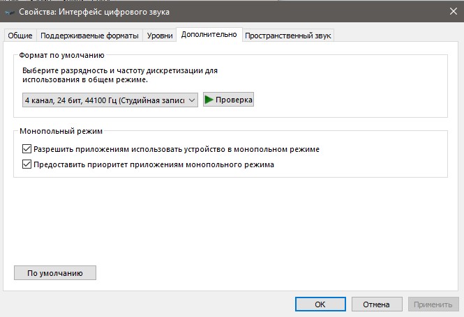 Опять пытаюсь разобраться с проблемой. Похоже дело не в герцах и битах, а в каналах. В моем интерфейсе 4 канала. Как нибудь можно это исправить, чтобы фубар проигрывал через него? Есть еще один вариант на 48 000 Hz, но тоже 4 каналаUnrecoverable playback error: Unsupported stream format: 48000 Hz / 16-bit / 2 channels (0x3)"